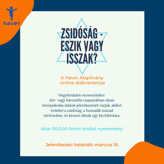 2020-ban önkénteseinkkel együtt álmodtuk meg és dolgoztuk ki azt a négyfordulós, két hónapon át zajló online diákversenyt, amelyet 2021 tavaszán és őszén is sikeresen megrendeztünk. A verseny során a résztvevők a zsidó kultúra, történelem és identitás témáival foglalkozhattak, emellett a 20. századi magyar történelem egyes aspektusait is érintették a feladatok (verseny honlapja: https://verseny.haver.hu/). A tavaszi fordulóban 14, az őszi versenyen pedig 20 csapat vett részt, az ország különböző pontjairól, változatos típusú oktatási intézményekből – alapítványi iskoláktól egészen szakiskolákig. A zsűrit mindkét alkalommal olyan pedagógusok és oktatási szakemberek alkották, akik régóta együttműködnek a Haverrel, kiegészülve egy-egy önkéntesünkkel.